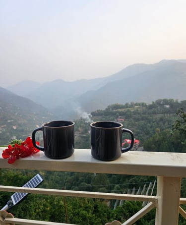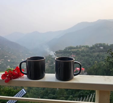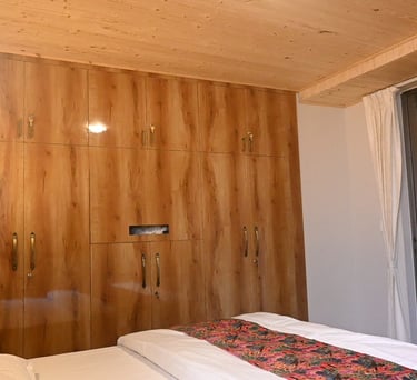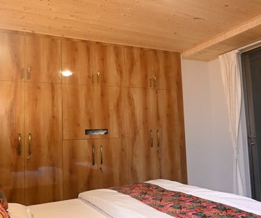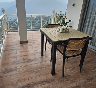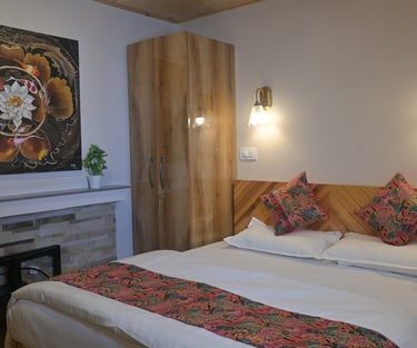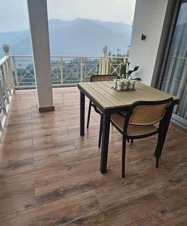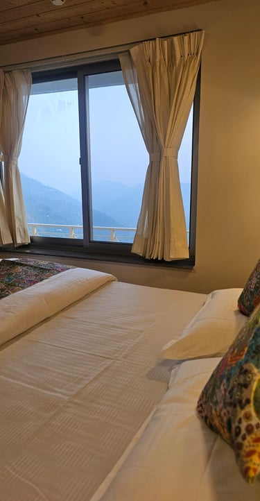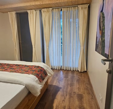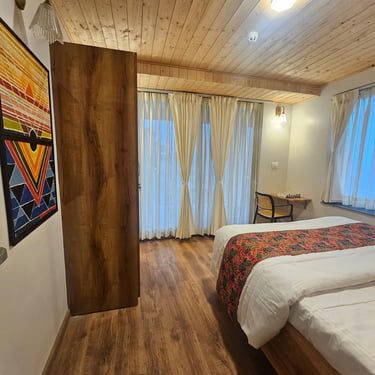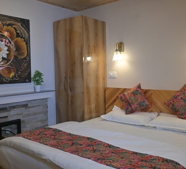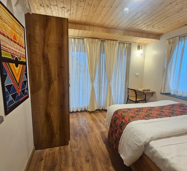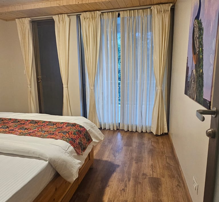Cozy Nook is a big yet cozy well lit & well ventilated room with a double bed with an attached washroom, closet and portable bio-fuel fireplace with a lovely sit out area extending into the valley side.