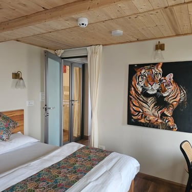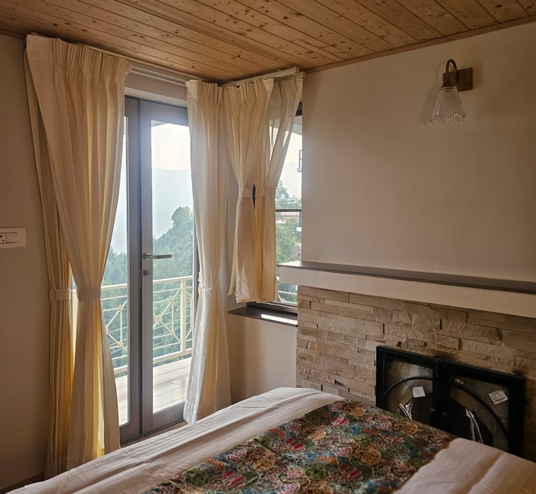 Hearth is a warm, cozy, naturally well lit & ventilated room with a double bed with an adjacent washroom and traditional fireplace with a beautiful valley and a mesmerising sunset view with a long balcony.